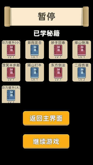 1.在游戏中选择适合自己武功秘籍,在通关的道路上给你帮助。