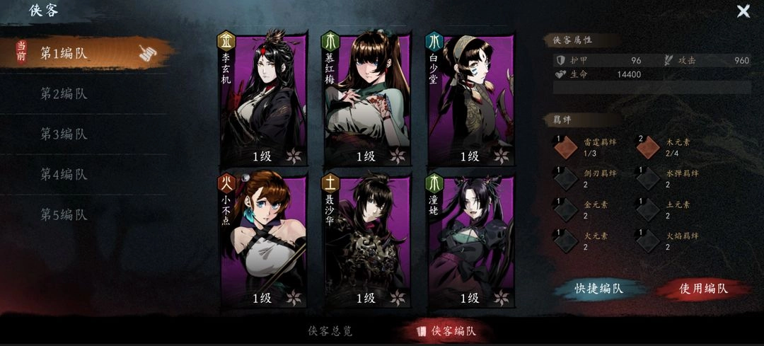 说明:点击编队中的某个侠客可替换单个侠客;点击快捷编队可一次性替换6个侠客。如果不足6个,则无法进入关卡!!!一定要注意