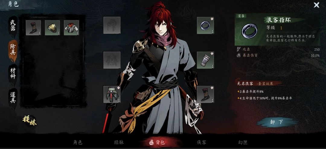 关卡中概率掉落防具,可组成套装效果,“提炼”防具可获得铜币