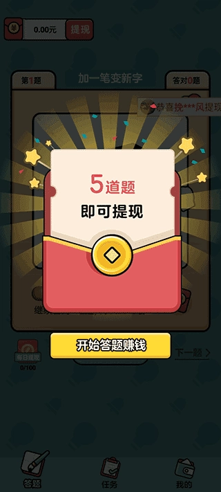 这是一款休闲益智的汉字游戏,玩家在游戏里能够闯过一关又一关的汉字关卡,进而获得红包奖励。