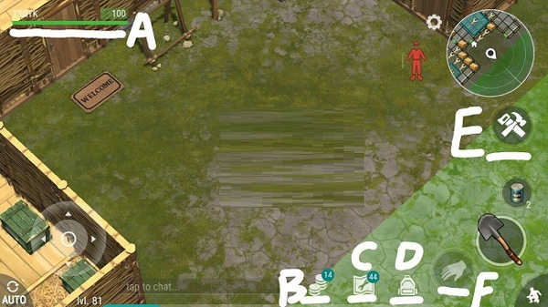 F:功能键,靠近目标物体时比平时亮即可点击使用(左下角为自动。右下角为潜行,潜行后在目标身后或左侧攻击可打出三倍伤害,面对鹿时必须潜行才可击杀)