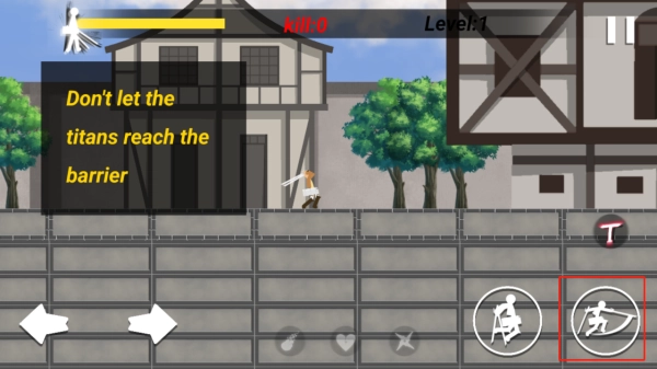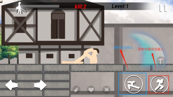 6、在变身巨人的时期,点击蓝框标志可以滑铲,点击红框标识可发动光波攻击