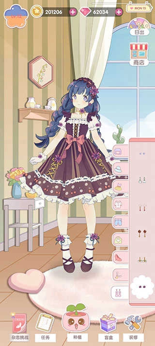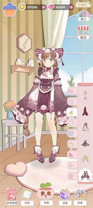 玩法上主要是种花、获取装扮然后闯关,家具建造算是独立的板块,目前没发现和主线有关联。C级和B级的衣服都只有一件连衣裙,没有上下装分开的款式(A级和S级还没解锁),所以一套装扮包含7件单品:头发、帽子、项链、衣服、鞋子和手饰。