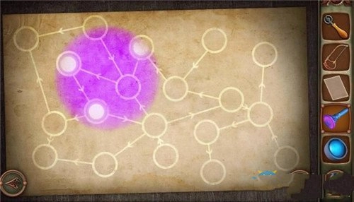 13、下楼梯后点击门,需要把6个图形调整成和之前图纸上一致的顺序才行。按照图纸上的箭头提示来操作,中间的圆是出发点,前面5个图形的顺序是正确的,只需把最后一个标志替换成带有4个螺旋的圆圈标志,再点击门就能打开,顺利通关。