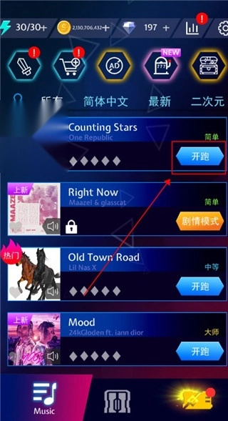 1、挑选一首歌曲,点击开跑按钮就能开启体验