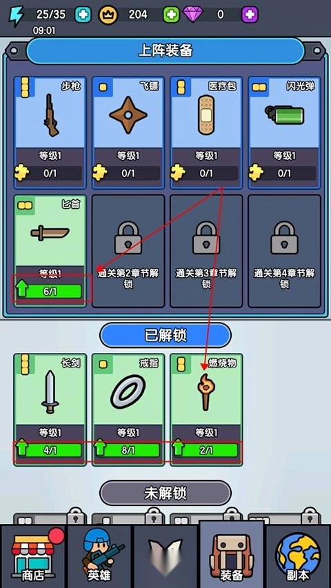 7.通过关卡可以获得大量装备,这些装备都可以进行升级提升,增加等级战力。