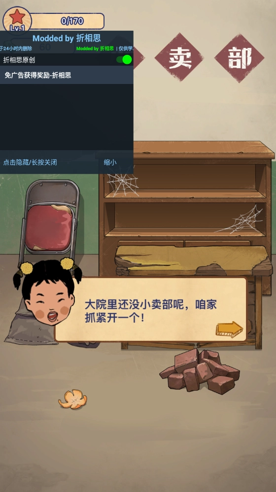进入游戏,按照图中所示,开始为建造小卖部清理房间!