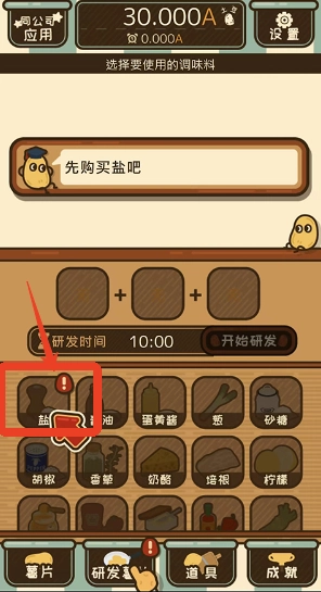 3、除了制作薯片还要研发新薯片,点击“研发”可以研发出新口味的薯片。