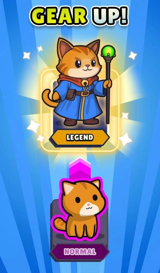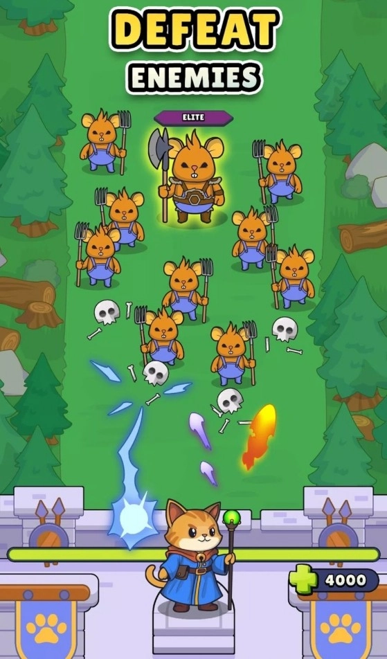 作为猫咪城堡最后的猫巫师,你必须站在抵御老鼠大军进攻的最前线。在你身后的,不仅是猫咪城堡的荣誉,还有成千上万的猫咪子民。海量的老鼠大军正迎面扑来,玩家需要借助猫魔法不断击溃它们的战线。随着关卡的推进,猫巫师也会在战斗中变得更强;当关卡进度达到一定程度时,还会获得三选一的技能选择机会,以此来对抗更强大的老鼠敌人。