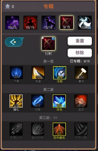 技能与专精:技能随等级解锁,专精点每通关一层获得一个。初期可使用扫射技能过渡。