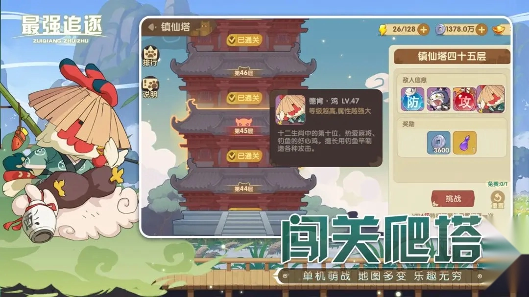 《最强追逐游戏》是一款融合古风与卡通风格的Roguelike跑酷闯关游戏,它将三国武将角色以猫咪形象呈现,让玩家操控这些“猫武将”展开跑酷冒险。游戏操作简单,玩家只需控制角色上下移动,角色会自动发射弹幕攻击敌人,而玩家的核心任务就是灵活躲避敌方弹幕,同时借助自动射击击败对手,体验刺激的闯关乐趣。