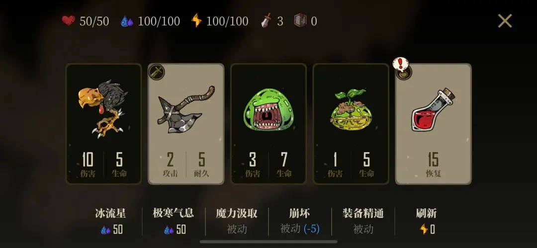 以最终关为例,其他关没有boss可以跳过第一步。首先是开局,测试版在没事用道具或攻击怪物之前可以免费刷新回合,找自己想要的道具,可以任意刷新找自己想要的刀盾。个人喜欢优先处理BOSS,也就寻找蓝色大剑加一个盾,然后找BOSS硬刚,然后刀盾剩余耐久找几个怪(精英优先,普通次之,小怪千万不要)处理掉就好了,一般刷新五回合之后如果还是没有那就重新开局吧,反正是开局。然后进入打怪环节,开始重新寻找刀盾(尽量控制在四回合以内,走多了体力不够用),找高刀高盾打精英,任意刀低盾打普通,低刀低或没盾打小怪,怪多了武器耐久够就冻一下,耐久耗没后重新找刀盾,以此循环,优先处理同一类怪,减少怪物数量,注意打同一只怪一刀最好,尽量两刀秒,需要三刀的怪尽量两刀用盾防,砍四刀的情况只能发生在打小怪时。最后是收尾阶段了,看见有什么就用什么吧,优先注意血量是否够用。