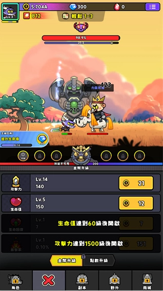 2、玩家们可以花费金币升级游戏里的基础属性,玩家们可以升级攻击力,生命值,击败游戏里的所有敌人,游戏里玩家们还可以主动挑战游戏里的BOSS,确保自己可以成功挑战的情况下哦;