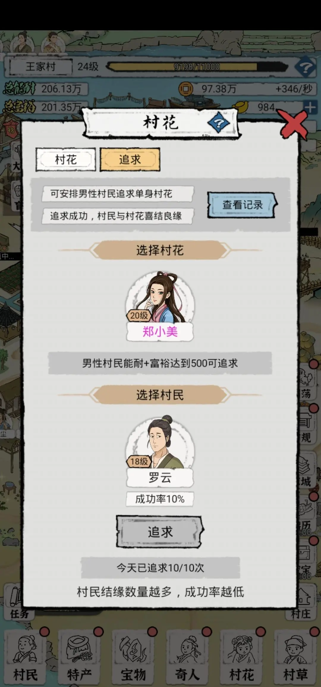 四、村花选择,只追求紫色品质以上的村花追求,有不低的加成,但是需要有一定的条件。