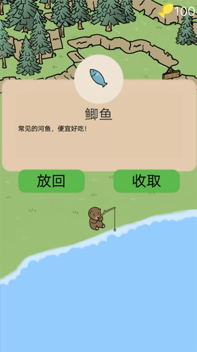 在池塘边,玩家操控小熊用鱼竿钓鱼,当成功钓到鱼后,需要长按屏幕来消耗小鱼的体力。