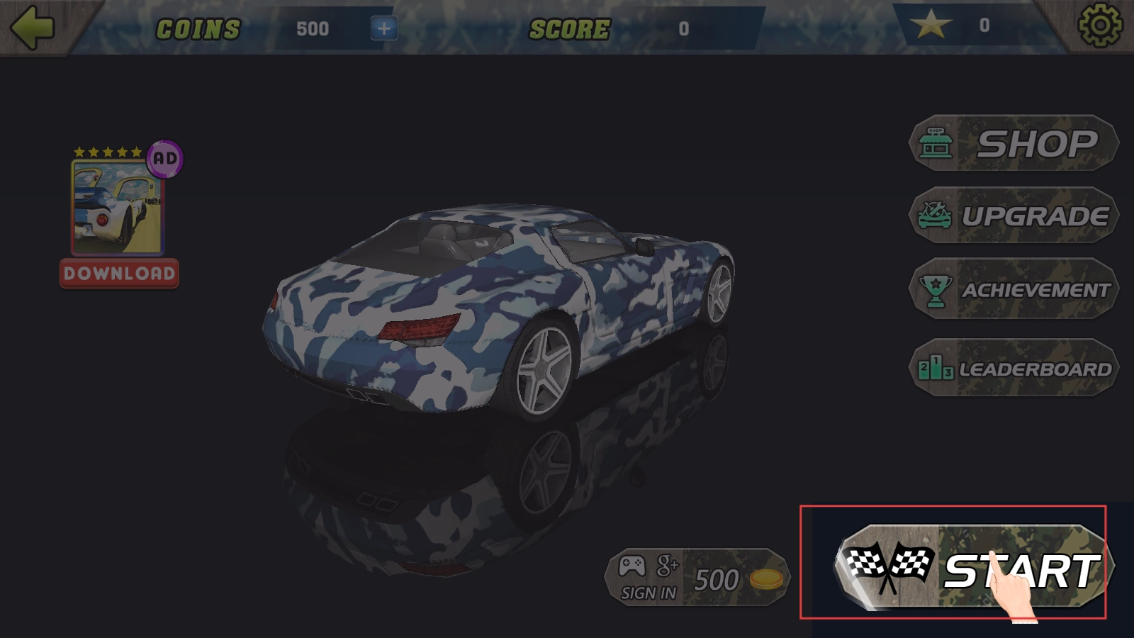 1、玩家结束游戏后回到游戏主界面,点击START按钮,就能进入游戏流程,准备开启赛车之旅。