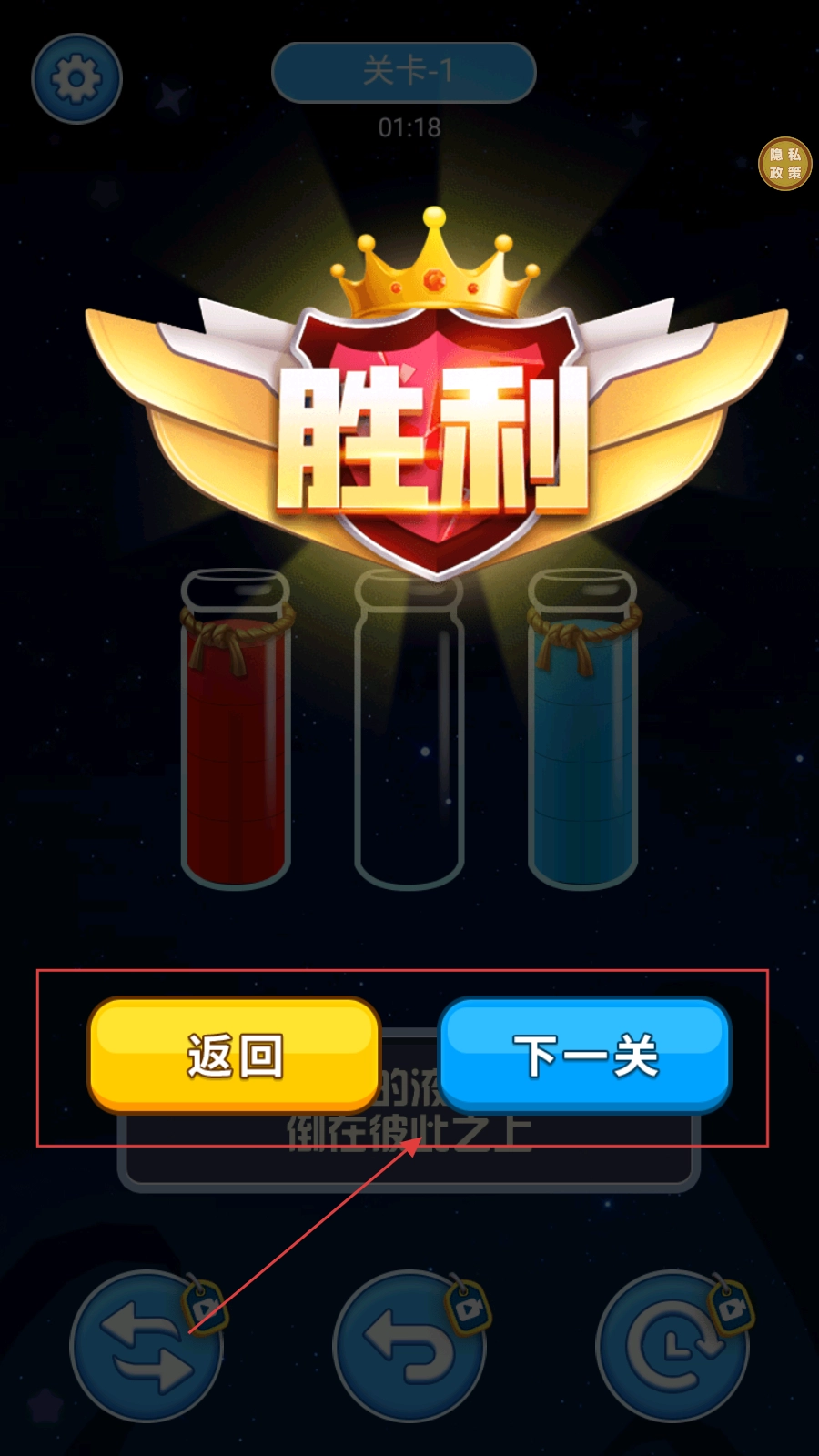 3、将中间瓶红色液体倒入左侧同色瓶,蓝色倒入右侧同色瓶,让同色液体归瓶,达成通关条件。
