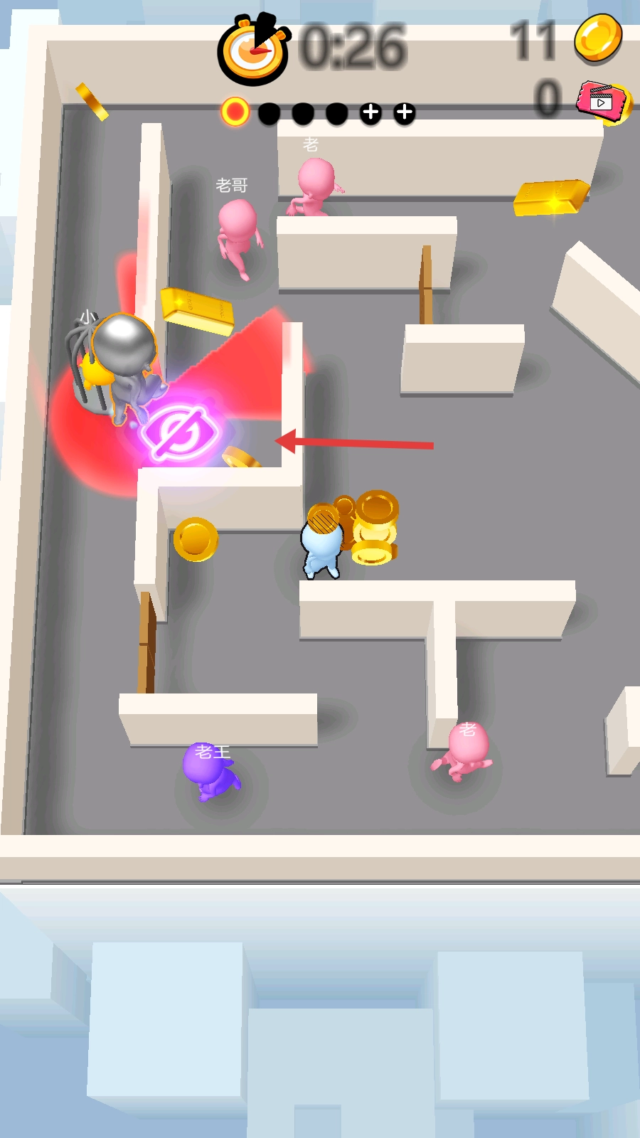 1、我们操控蓝色小人,在倒计时结束前,收集金币和金条,同时要留意周围的敌人,避免被发现。