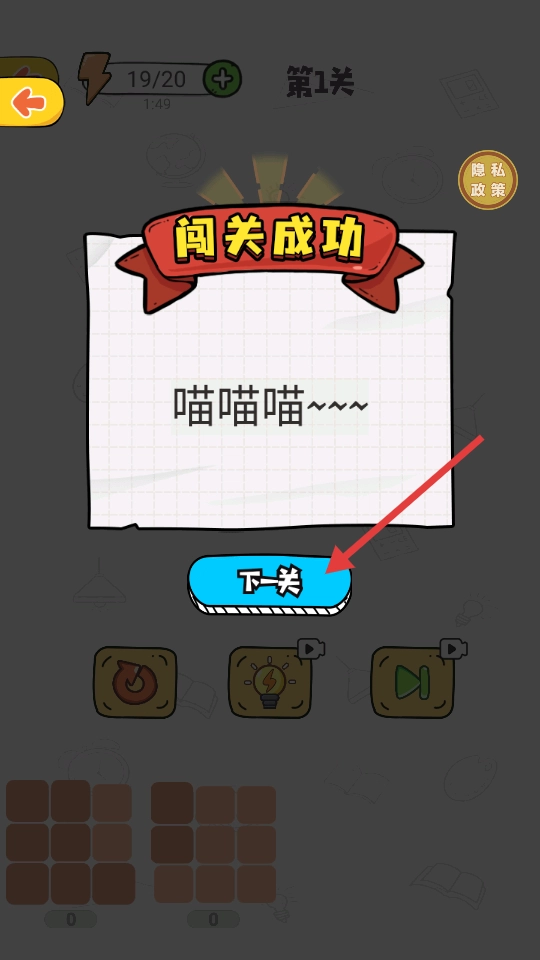 3、闯关成功,点击【下一关】,进入第2关。