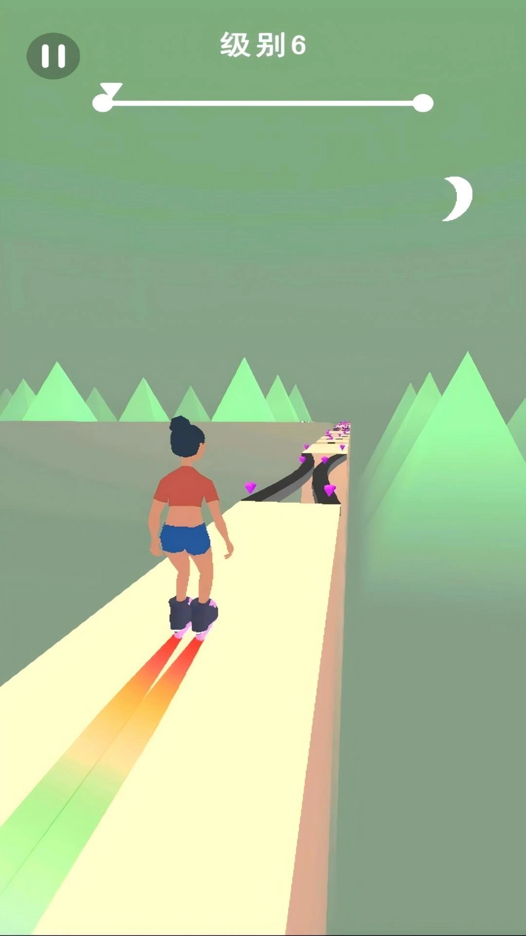 操控脚踩轮滑的角色,在各类障碍物间穿梭,目标是顺利抵达终点。