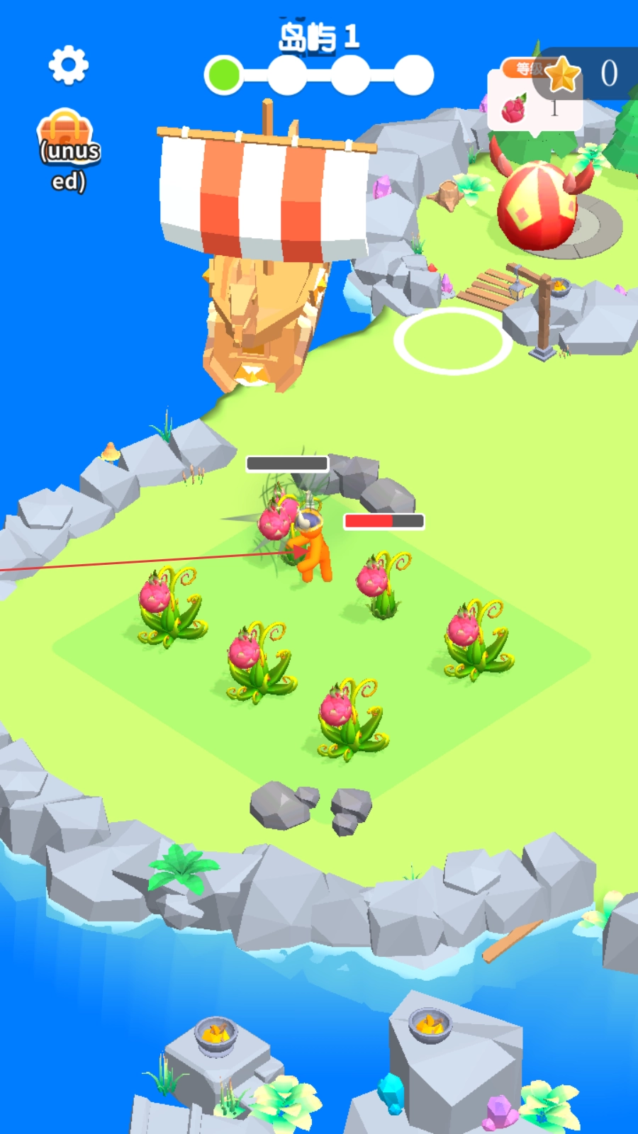 2、滑动屏幕操控角色靠近粉色果实植物,自动采集资源,积累物资。