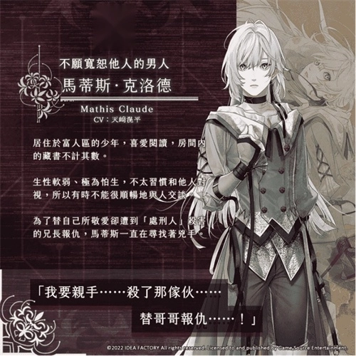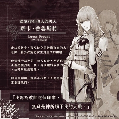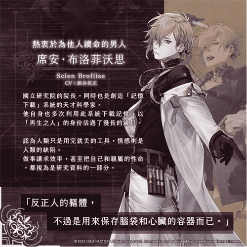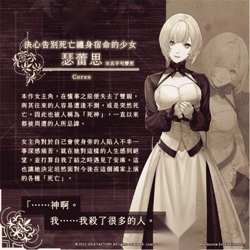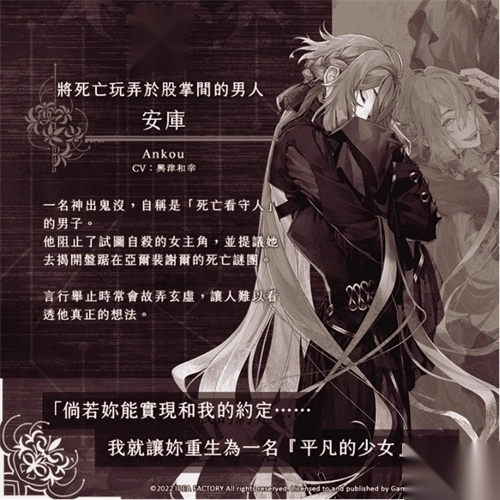 《终远的威尔修》是一款面向女性玩家的恋爱冒险游戏。故事发生在名为亚尔裴谢尔的国度,这里的国民受“死亡诅咒”束缚,寿命仅有二十三年。为了挣脱这份宿命,人们研发出“记忆”系统,借助克隆与记忆移植技术化身为“再生之人”。女主角瑟蕾思因身边亲友常未及二十三岁便离世,被周遭冠以“死神”之名。就在她陷入绝望之时,一位自称“死亡看守人”的青年安库出现在她面前,向她提出了一项能让她“成为普通人”的神秘交易。