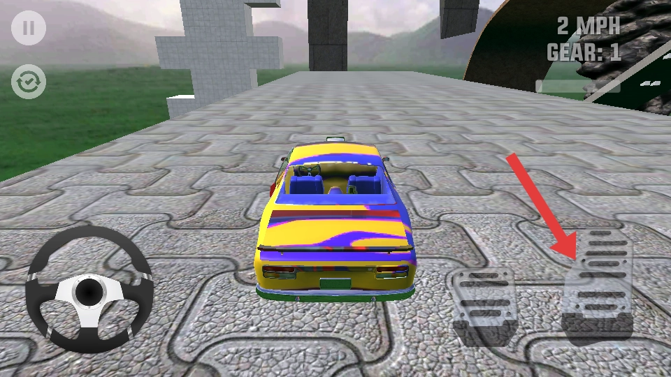 2、进入游戏关卡后,通过点击【红箭头】指示的【油门按钮】来驾驶汽车前进。