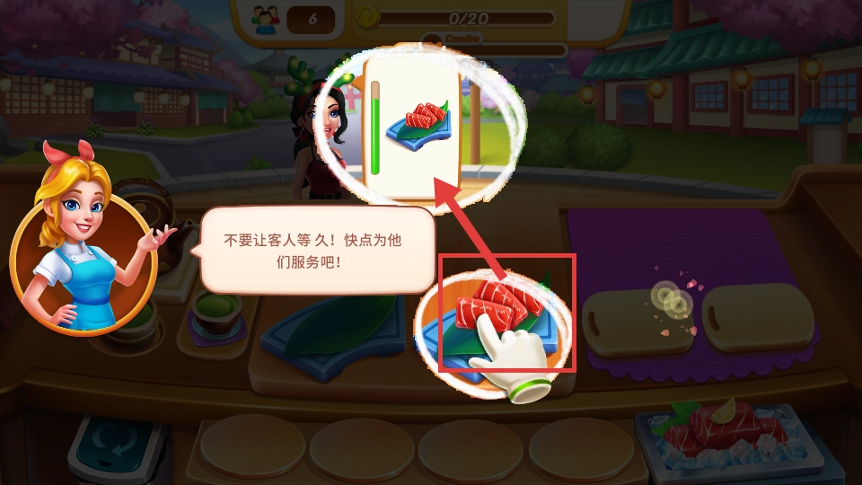 4、通过上菜赚取硬币,当上方进度条达成收集目标,即可成功过关。