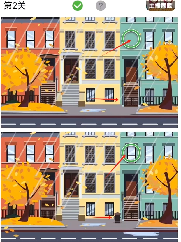 全民找茬2第5关答案:二楼右边窗户、左边窗户顶、地上的树叶、右边楼房前的水与物体
