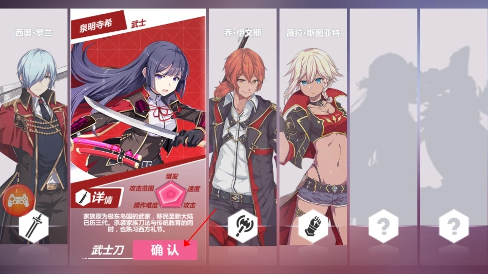 2、泉明寺希:武士,家族原为极东岛国的武家,移民至新大陆已历三代。承袭家族刀法与传统教育的同时,也熟习西方礼节。