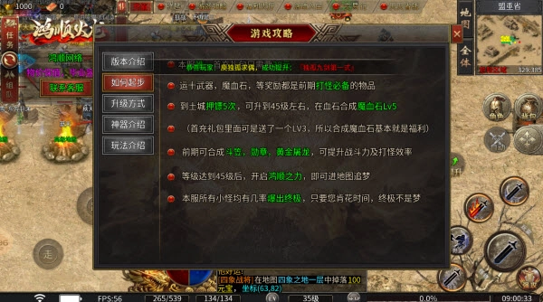 4、前期可合成斗笠,勋章,黄金屠龙,可提升战斗力及打怪效率等级达到45级后,开启鸿顺之力,即可进地图追梦。