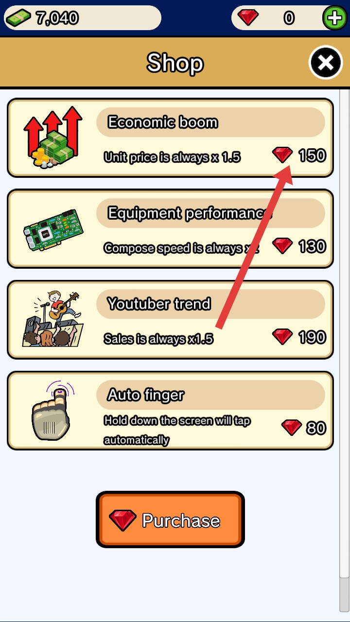 3、前往Shop界面,可用钻石购买增益效果,例如Economicboom能让单价始终增加,助力提升收益。