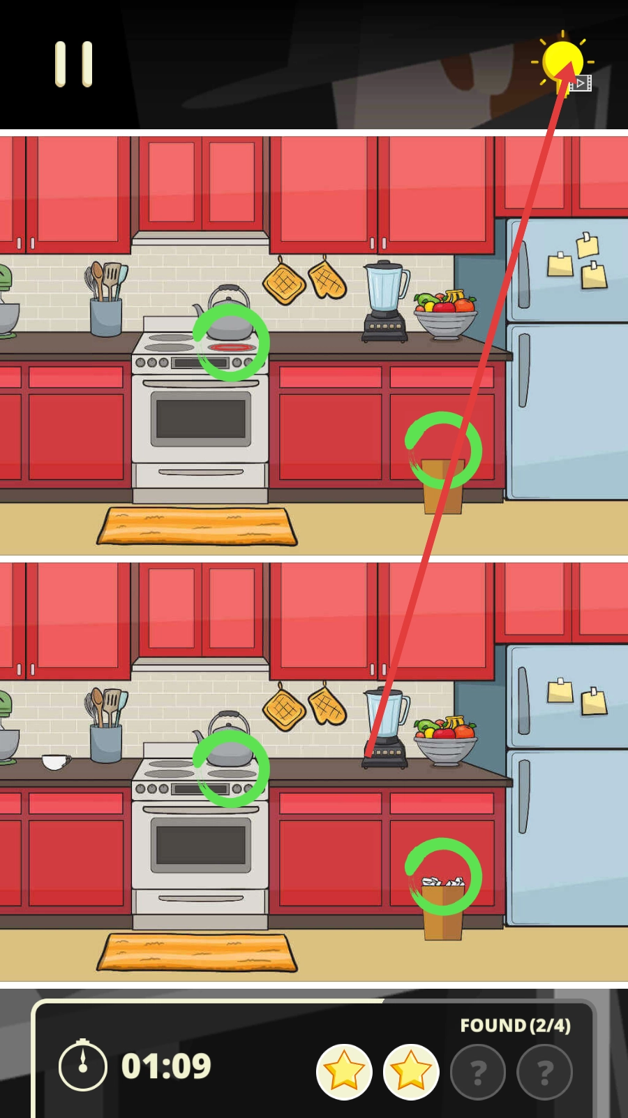 3、卡关时点击灯泡图标,获取提示,快速找齐不同处。
