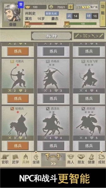 相生相克,步克弓,弓克骑,骑克步。更高级的兵种需要达到一定官职,拥有对应兵书后解锁,兵书在主要在城市的【搜索】和“意外之财”两个地方几率产出。