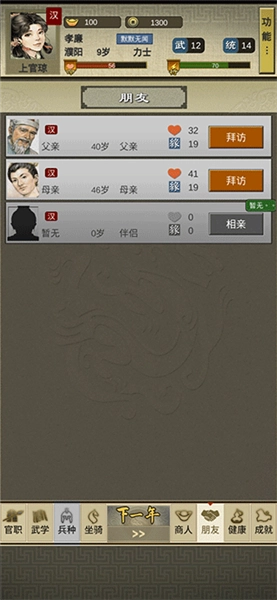 2、选择人生方向:是要辅佐君主治理地方成为贤臣?还是要征战沙场一统天下成为骁将?亦或是沉迷武力赢得御前比武大赛名震天下等等,不同的人生方向游戏内的侧重点会有所不同,从文从武或者归隐田园,一切皆有可能。