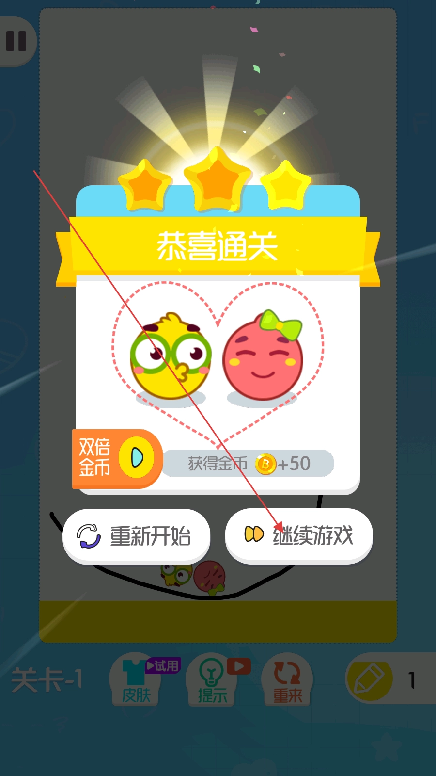 3、通关后点【继续游戏】解锁新关卡,也可看广告【双倍金币】,积累金币用于皮肤解锁。