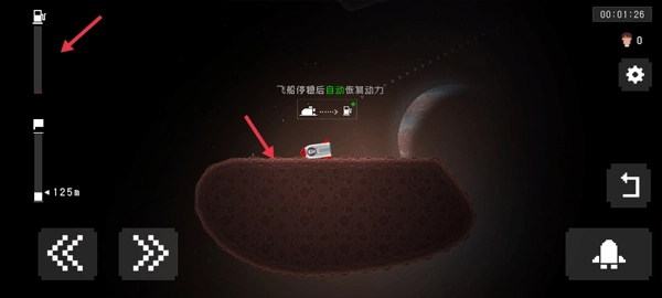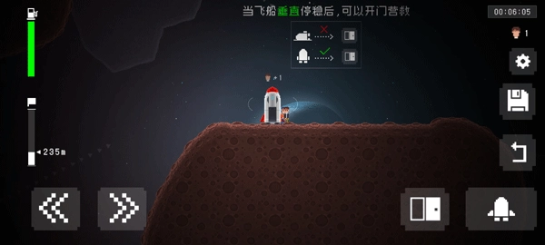 4、玩法是发射火箭到各个小区域,每个区域可能有幸存者,需要将他们救出;飞船停稳后,左侧红色箭头指向的燃料会自动恢复。