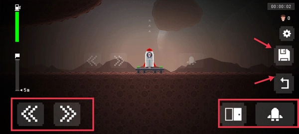 3、基本功能键说明:左侧为左右方向键,控制火箭方向;右侧是开舱门和发射按钮;红色箭头指向的功能,一个用来返回到初始状态,一个用来存档。