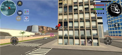 2、进入游戏界面有各种操纵按钮,包括移动键、冲刺键、绳子按键、截图按键、跳跃按键、进车按键、超级强力踢按键,绳子不仅可以用来攀爬,也可以用来对付敌人!