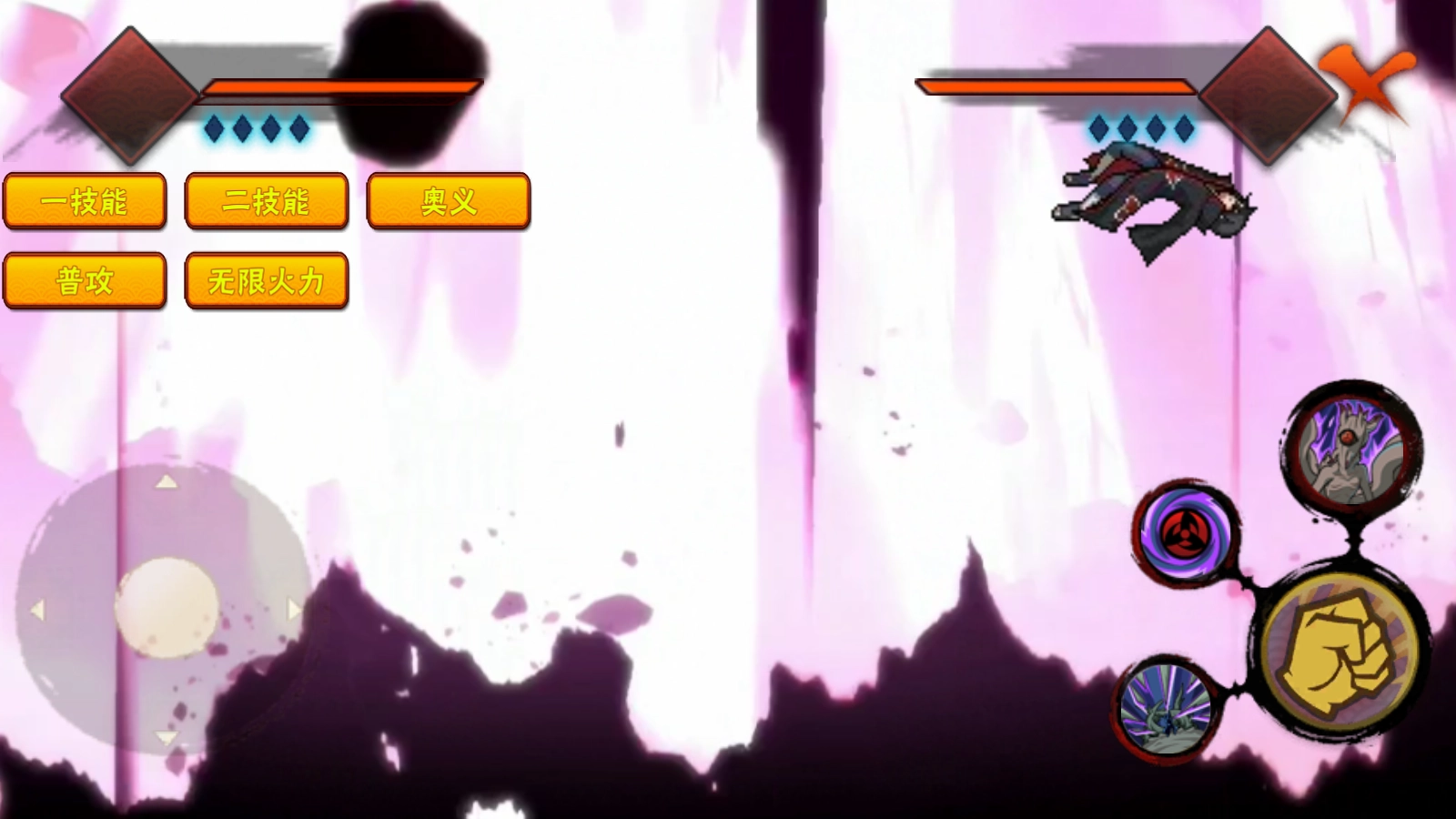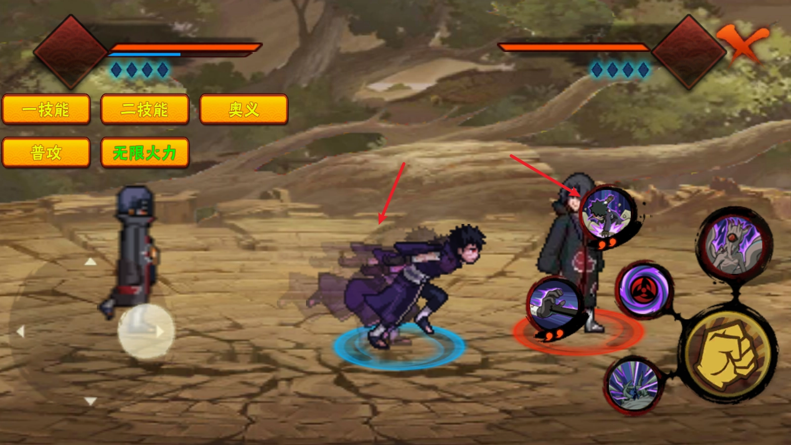 1、像素风格的火影格斗游戏,忍者的技能还原做的非常不错,尤其是忍战带土,虚化非常有意思。
