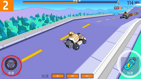 玩家进入游戏之后,可以看到左边有方向盘图标,按下可以变道。