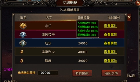 土城右边点击【开启沙捐】,增加大量特殊属性,然后点击【捐献排行】
