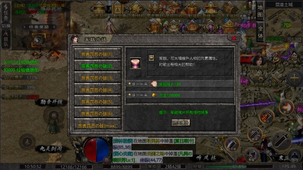 4、军鼓升级:通过打怪获得军鼓残片来升级,能够大服提升任务的元素属性,对输出有极大的帮助!