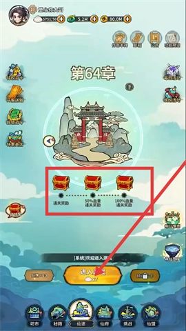 1、在第64章的关卡界面中,请留意红框内标注着不同条件的通关奖励宝箱。建议尽量以满血或较高血量的状态完成关卡,这样能获得更丰厚的奖励。准备就绪后,点击【进入游戏】按钮即可开启挑战。