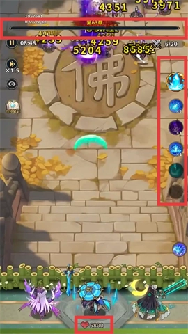2、战斗过程中,关注红框内的关卡进度条、怪物血量数值以及我方角色生命值,合理运用右侧红框内的技能图标,击败怪物以推进关卡进程。