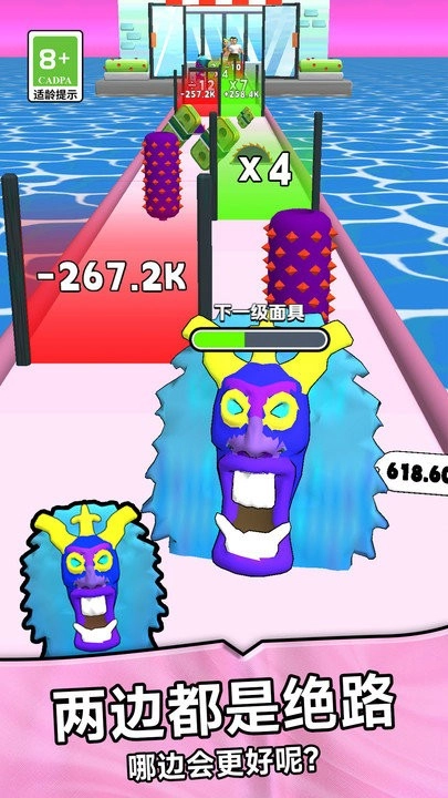 面具进化是一款融合了面具制作与市场竞争元素的刺激跑酷小游戏。在游戏中,你需要巧妙挑选各类道具、精心修饰面具,力求打造出完美的作品来吸引收藏家的关注,最终让这些面具能被珍藏于博物馆之中。随着游戏进程的推进,通过不断实现面具的进化,做出正确决策并规避错误操作,你就能逐步提升面具的价值,赢得更多收益,同时避免在竞价环节中被误导。