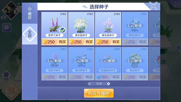 2、抵达花园后,直接去购买鲜花种子,其价格没有太大区别,要想购买等级比较高的鲜花,还得提升角色种植等级,购买种子的数量与拥有的花盆数量有关,记住了,只有拥有鲜花种子后才可以进行种植。