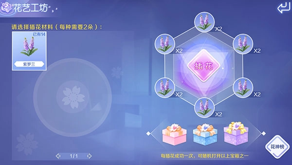 4、所有的成品鲜花,全部都能进入花艺工坊中插花,每次插花还得消耗12朵鲜花,只要简单点击界面中的插花按钮后,并且每次插花成功,还能随机打开一种宝箱。另外玩家还可以在花艺工坊中,打开花神榜来查看排行榜。