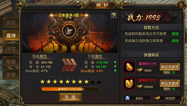 能显著提高防御力与攻击力,盾牌碎片可通过回收装备、击杀 BOSS 获取,升级后可免疫 BOSS 伤害。