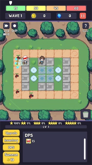 4、进入关卡后点击左下角的summon可以召唤英雄,然后点击skip开始闯关。